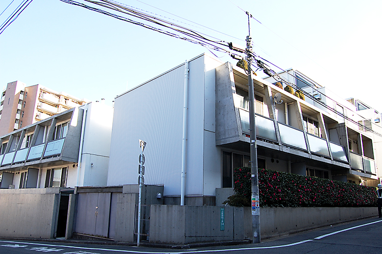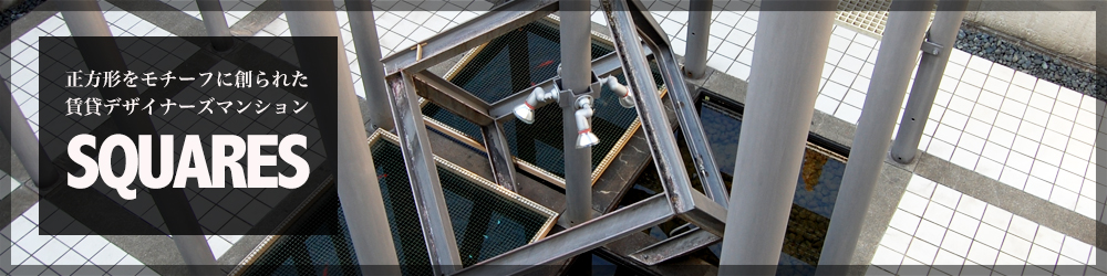 正方形のモチーフでつくられた中庭を囲み、東西南北に4棟建ち並んだ集合住宅です。中庭側とバルコニー側に大きな開口部があり、プライバシーを保ちながら、自然採光や風通しが充分にできるようにしてあります。それぞれの玄関前には2,3戸で共用のテーブルをしつらえ、外で集える空間としました。2階建ての北側の上には屋上庭園があり、自然に囲まれた中で、日光浴や眺望を楽しむことができます。中庭には、テーブルやベンチや池があり、居住者の方すべてがそこを通り、自然な形で顔をあわせるようにしました。約35m²のワンルームが中心ですが、室内は可動家具の移動によって、領域に変化をつけることができます。また可動棚がつき、扉で隠す収納を多くつけると共に、グリッド状の飾り棚により見せる収納も用意しました。3階には、吹抜けのある66m²と50m²のメゾネット住居もあります。(谷内田章夫)